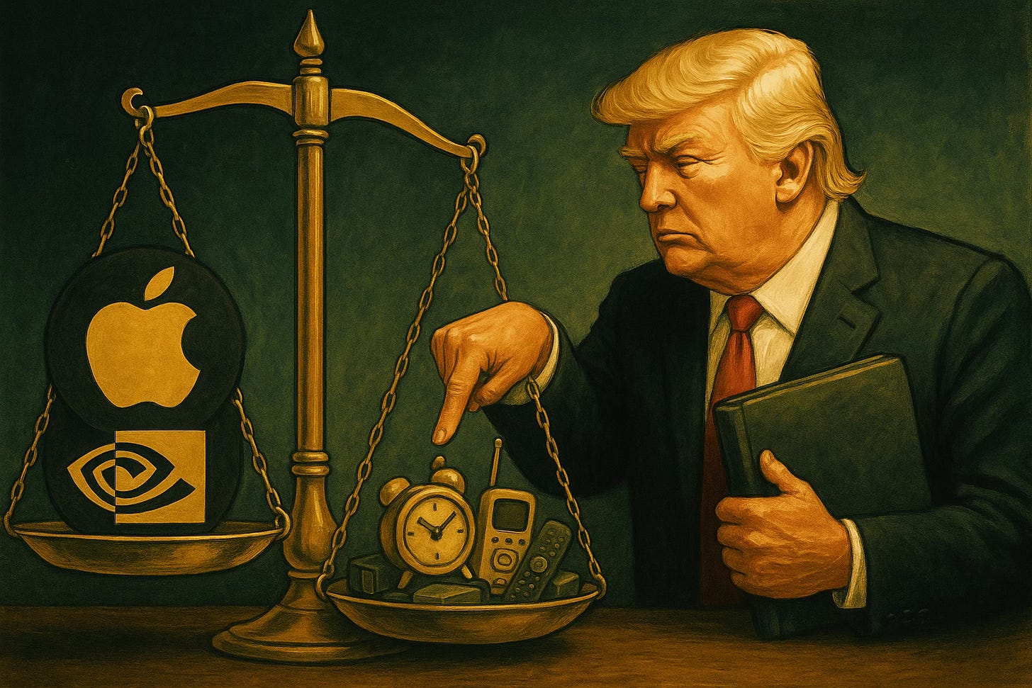 August 6th rolls around, Tim Cook shows up at the White House with a gold-plated plaque and a $100B manufacturing promise… and suddenly Apple gets its Get Out of Tariff Free card.