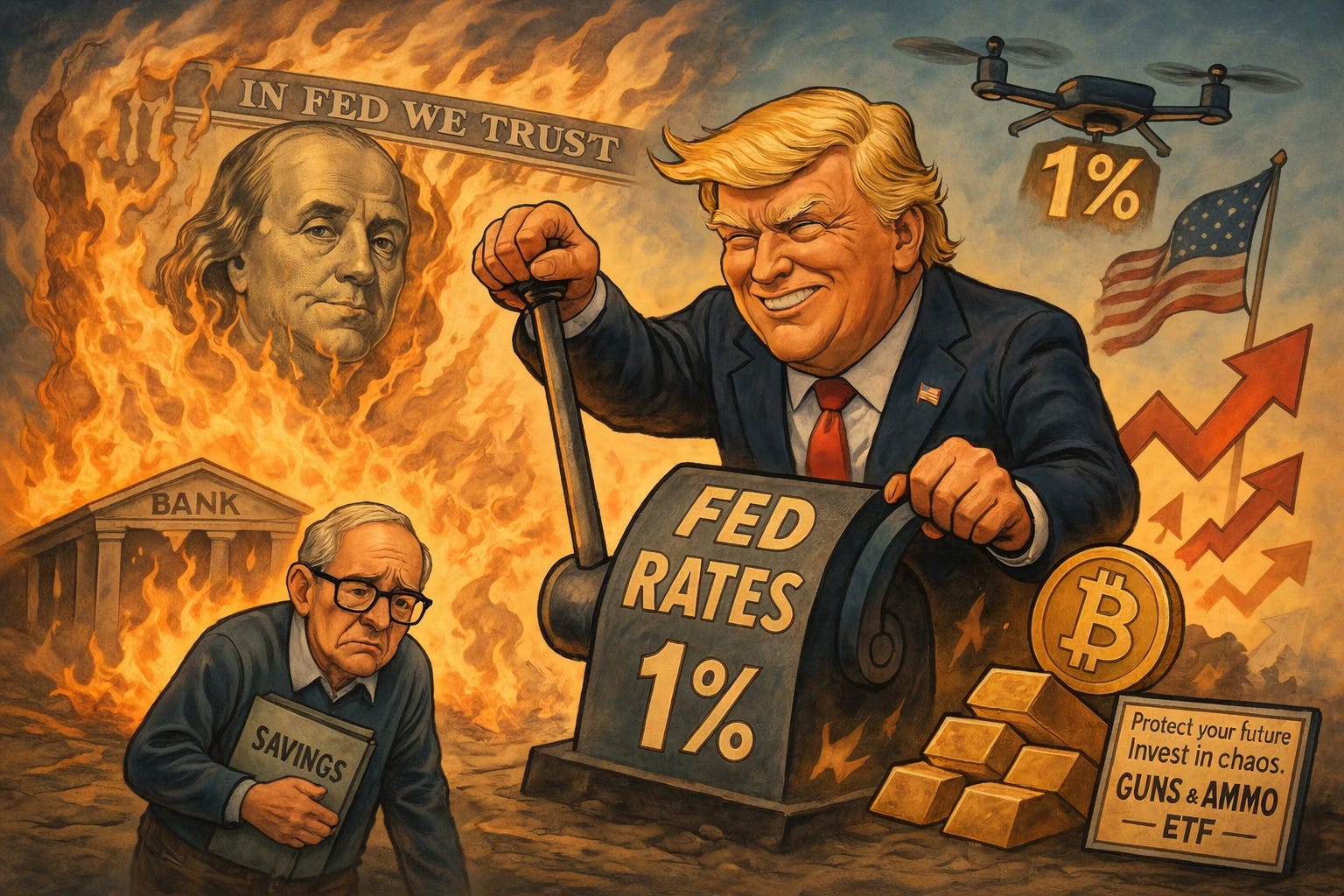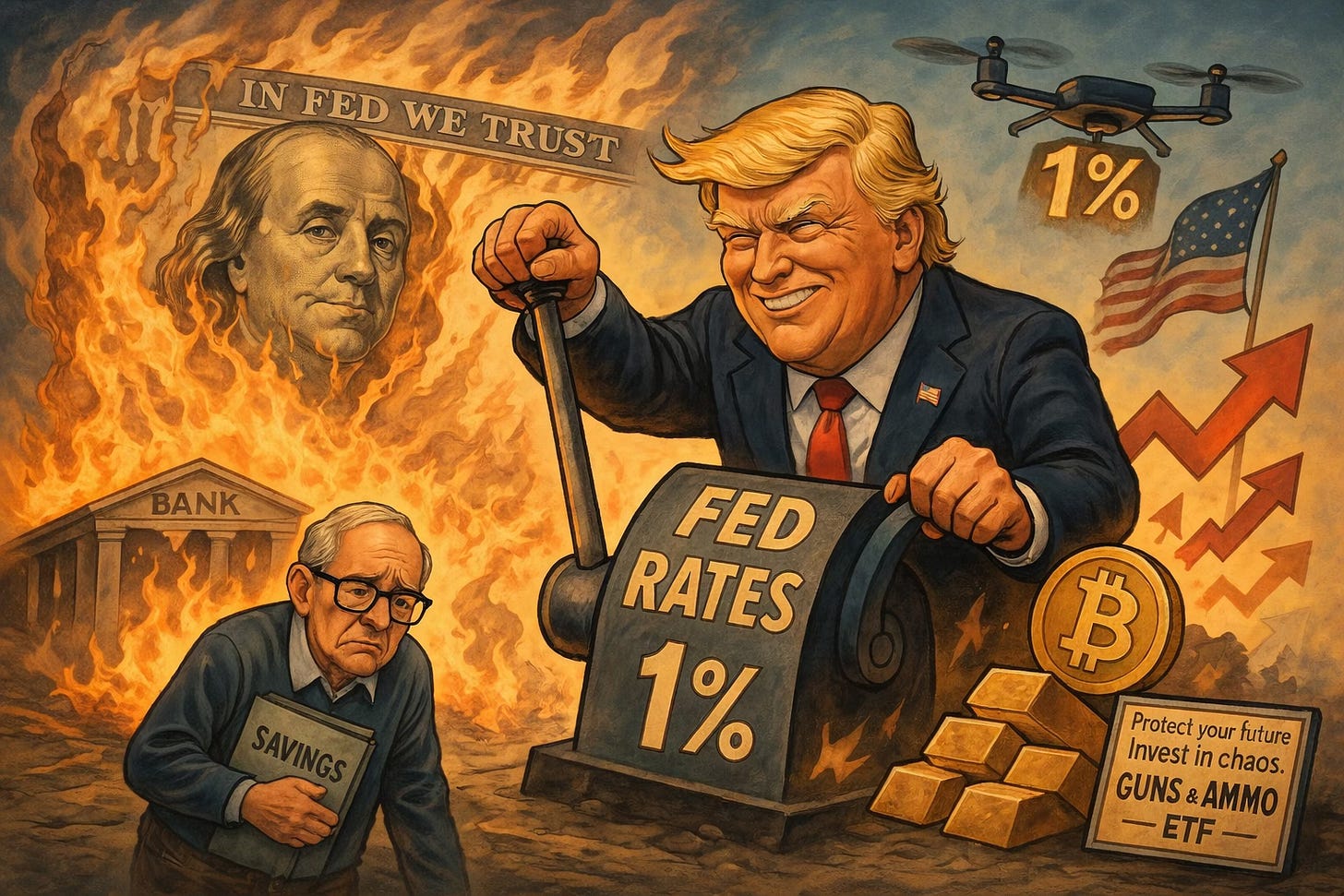 The only way to force rates to 1% is massive QE: printing money to buy debt. It’s MMT in action, the same strategy bolstering gold and bitcoin. The irony is delicious. Trump’s promoting policies that make his crypto investments more valuable by destroying the dollar.