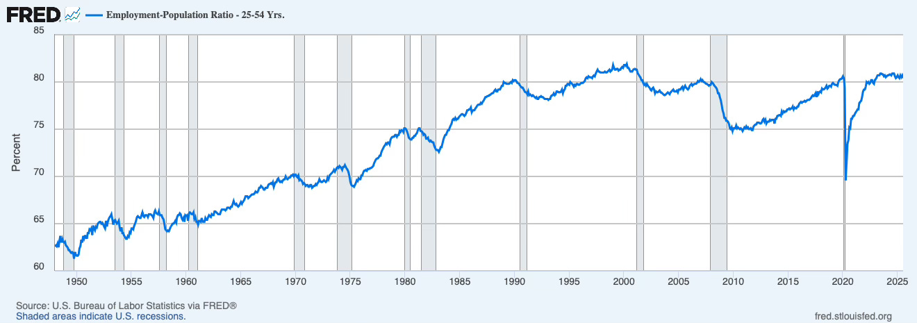 Prime-age employment-to-population ratio (25–54): 80.4% in July 2025. Off the spring highs.