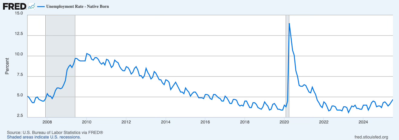 Use ratios. Native-born unemployment in July 2025: 4.7%. Highest since 2021. Up from 4.5% in July 2024.