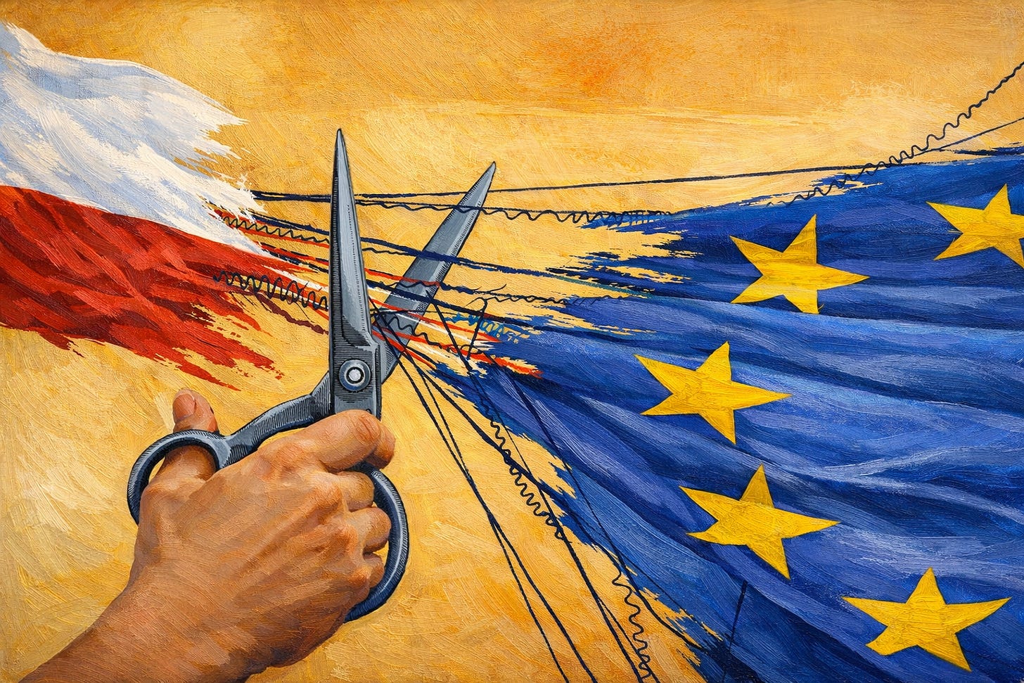 Poland’s version of that dynamic is already running. PiS doesn’t campaign on Polexit. Mateusz Morawiecki praised the veto as the right decision. Sławomir Mentzen of Confederation echoed him. Nobody says exit. Nobody needs to. Each blocked loan, each sovereignty tantrum, each refusal to engage with EU fiscal architecture produces the same functional result: a country inside the bloc but unable to use its instruments. Paying dues. Forfeiting benefits. Drifting.
