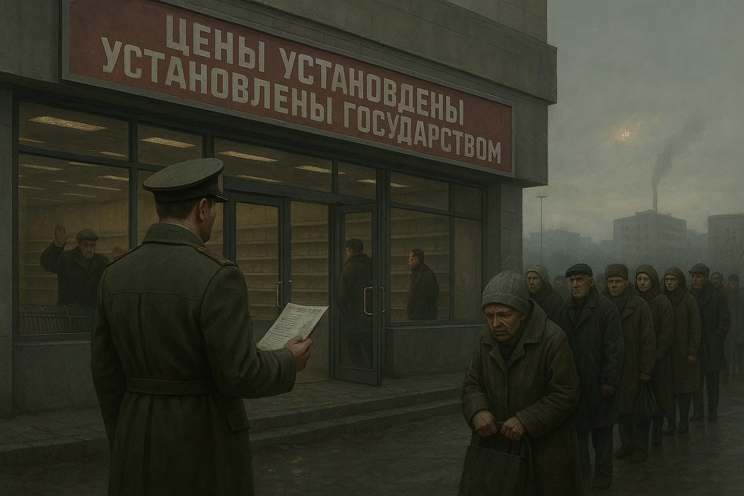 That’s when Russia implements state-mandated prices for potatoes, milk, eggs, sunflower oil, carrots, tomatoes, onions, apples, and sugar. Fixed prices. Court orders required to break contracts. By 2028, ninety percent of food production gets routed through this machinery.