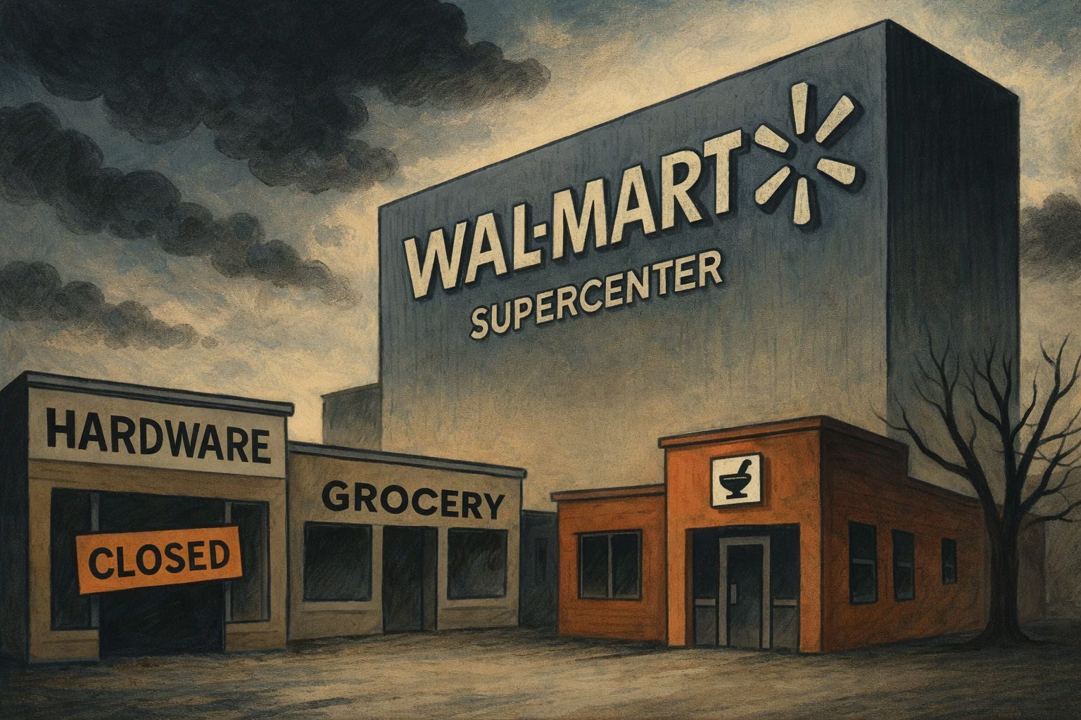 This is no longer abstract theory. Talk to anyone who’s watched a town get gutted by a Supercenter. The pattern is depressingly consistent. One day you have local grocers, hardware stores, regional pharmacies. Then Walmart arrives. It offers prices that local shops can’t match because those prices are artificially suppressed by scale, logistics, and political muscle. The locals try to compete. They slash prices, cut hours, lay off staff. Eventually they close. Some end up working for the same corporation that ran them out. Others leave town.